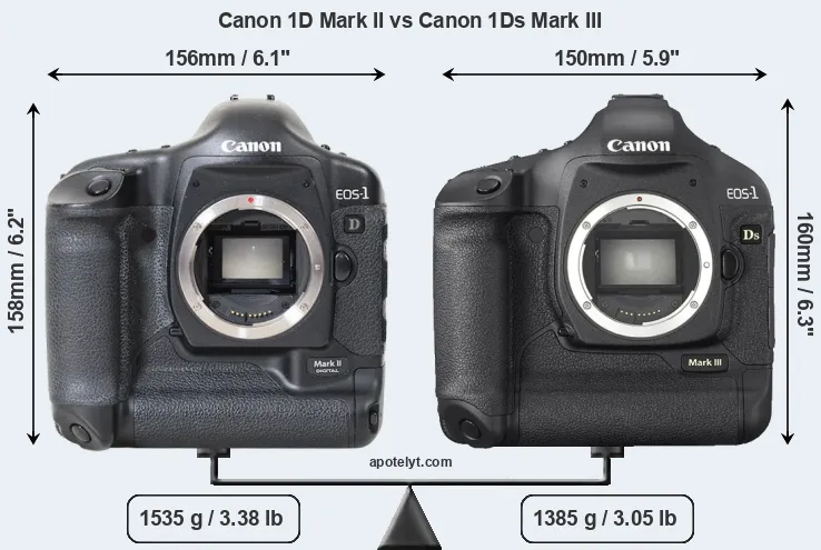 An illustration of the physical size and weight of the Canon 1D Mark II and the Canon 1Ds Mark III is provided in the side-by-side display below. The two cameras are presented according to their relative size. Three consecutive perspectives from the front, the top, and the back are available. All size dimensions are rounded to the nearest millimeter.