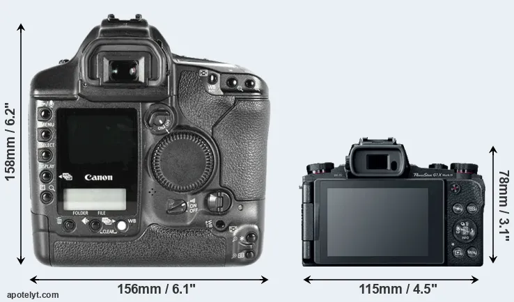 The physical size and weight of the Canon 1D Mark II and the Canon G1 X Mark III are illustrated in the side-by-side display below. The two cameras are presented according to their relative size. Three consecutive views from the front, the top, and the rear side are shown. All size dimensions are rounded to the nearest millimeter.