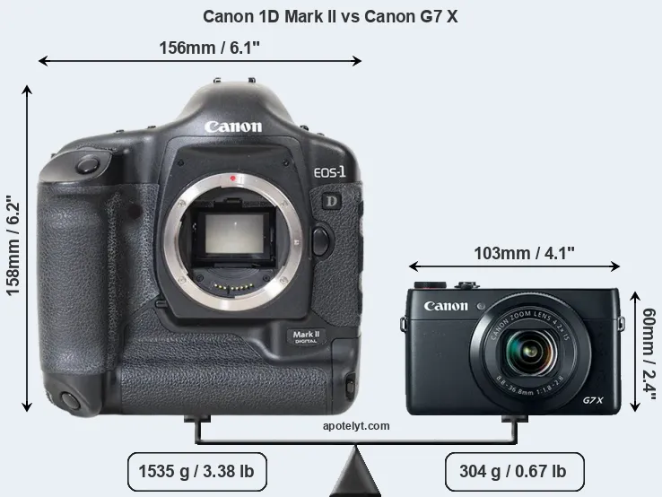 An illustration of the physical size and weight of the Canon 1D Mark II and the Canon G7 X is provided in the side-by-side display below. The two cameras are presented according to their relative size. Three consecutive views from the front, the top, and the rear side are shown. All width, height and depth measures are rounded to the nearest millimeter.