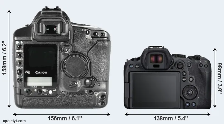 The side-by-side display below illustrates the physical size and weight of the Canon 1D Mark II and the Canon R6 Mark II. The two cameras are presented according to their relative size. Three consecutive views from the front, the top, and the rear side are shown. All width, height and depth dimensions are rounded to the nearest millimeter.
