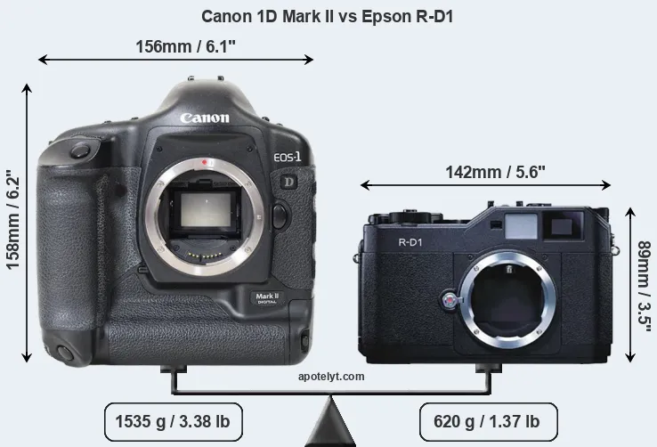 If the front view area (width x height) of the cameras is taken as an aggregate measure of their size, the Epson R-D1 is considerably smaller (49 percent) than the Canon 1D Mark II. Moreover, the R-D1 is substantially lighter (60 percent) than the 1D Mark II. It is worth mentioning in this context that the 1D Mark II is splash and dust resistant, while the R-D1 does not feature any corresponding weather-sealing.