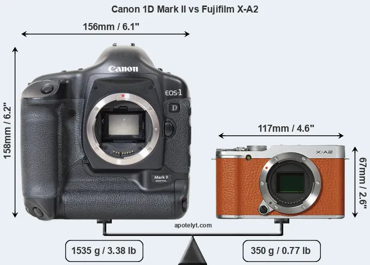 The physical size and weight of the Canon 1D Mark II and the Fujifilm X-A2 are illustrated in the side-by-side display below. The two cameras are presented according to their relative size. Three consecutive perspectives from the front, the top, and the back are available. All width, height and depth dimensions are rounded to the nearest millimeter.