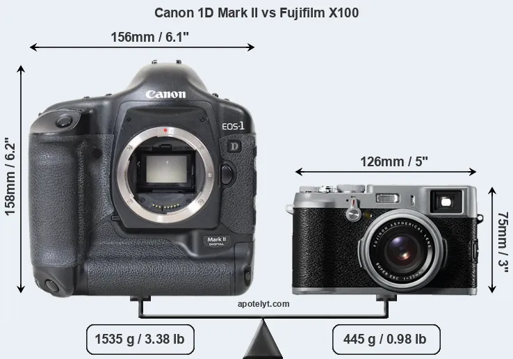 An illustration of the physical size and weight of the Canon 1D Mark II and the Fujifilm X100 is provided in the side-by-side display below. The two cameras are presented according to their relative size. Three successive views from the front, the top, and the rear are shown. All width, height and depth dimensions are rounded to the nearest millimeter.
