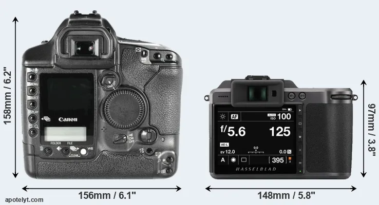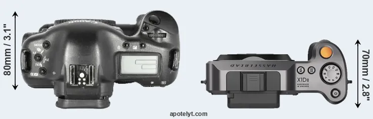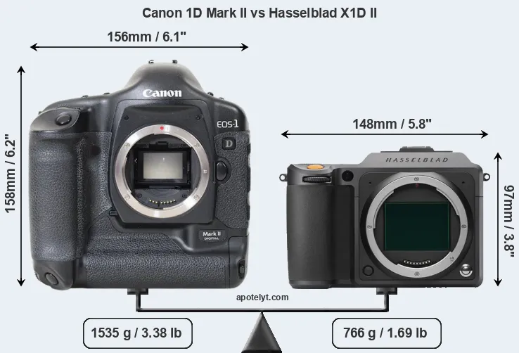 The side-by-side display below illustrates the physical size and weight of the Canon 1D Mark II and the Hasselblad X1D II. The two cameras are presented according to their relative size. Three consecutive perspectives from the front, the top, and the back are available. All width, height and depth dimensions are rounded to the nearest millimeter.