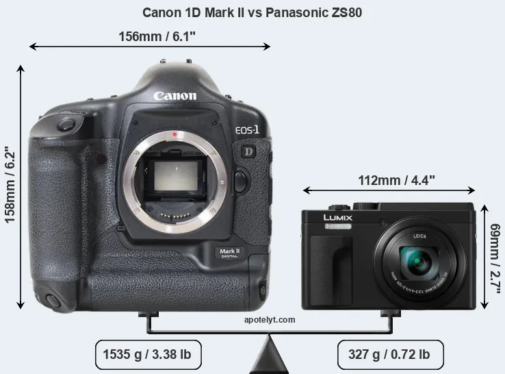 The side-by-side display below illustrates the physical size and weight of the Canon 1D Mark II and the Panasonic ZS80. The two cameras are presented according to their relative size. Three consecutive perspectives from the front, the top, and the back are available. All width, height and depth dimensions are rounded to the nearest millimeter.