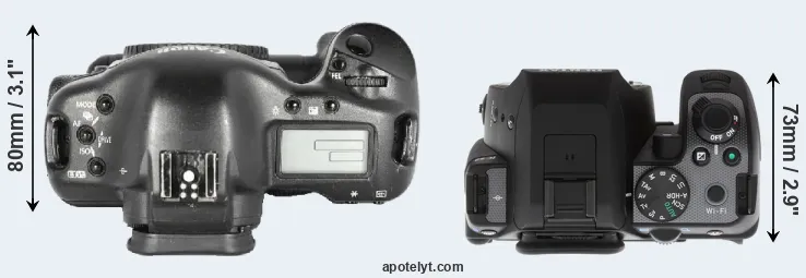 The side-by-side display below illustrates the physical size and weight of the Canon 1D Mark II and the Pentax K-S2. The two cameras are presented according to their relative size. Three consecutive views from the front, the top, and the rear side are shown. All width, height and depth dimensions are rounded to the nearest millimeter.