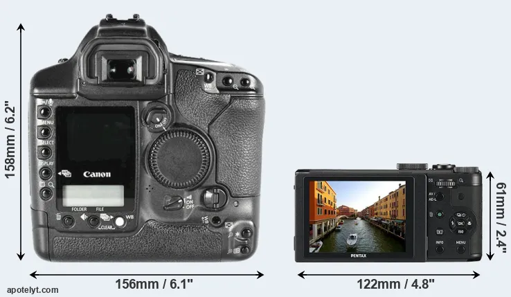 The side-by-side display below illustrates the physical size and weight of the Canon 1D Mark II and the Pentax MX-1. The two cameras are presented according to their relative size. Three successive views from the front, the top, and the rear are shown. All width, height and depth measures are rounded to the nearest millimeter.