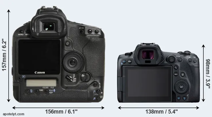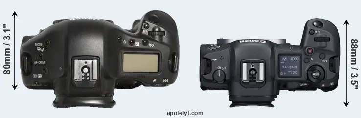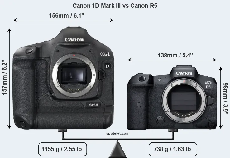An illustration of the physical size and weight of the Canon 1D Mark III and the Canon R5 is provided in the side-by-side display below. The two cameras are presented according to their relative size. Three consecutive perspectives from the front, the top, and the back are available. All size dimensions are rounded to the nearest millimeter.