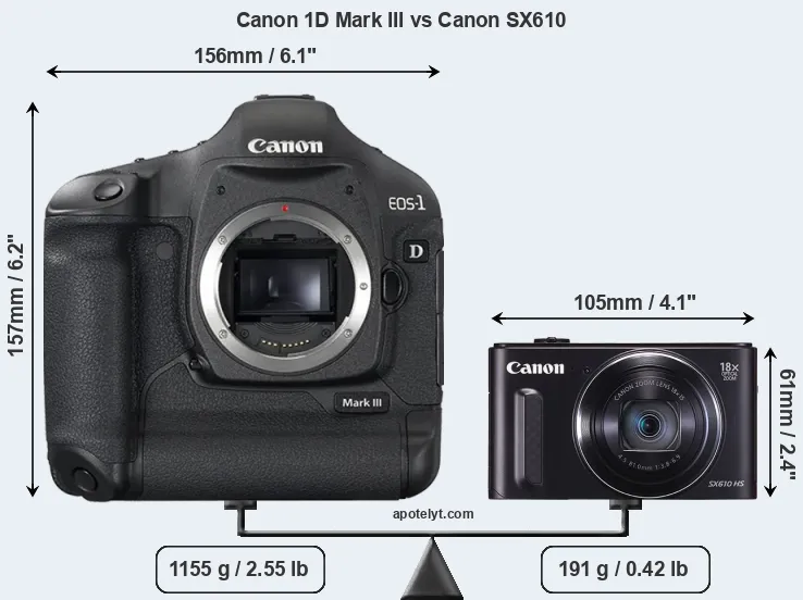 The side-by-side display below illustrates the physical size and weight of the Canon 1D Mark III and the Canon SX610. The two cameras are presented according to their relative size. Three successive views from the front, the top, and the rear are shown. All size dimensions are rounded to the nearest millimeter.