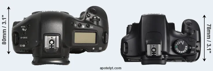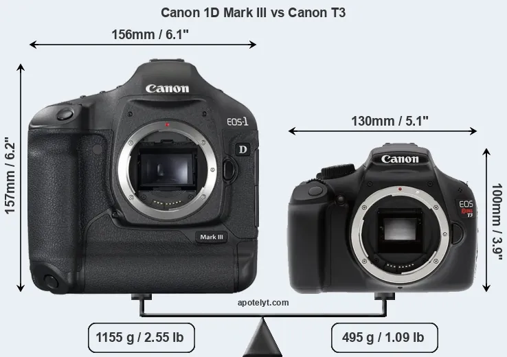 An illustration of the physical size and weight of the Canon 1D Mark III and the Canon T3 is provided in the side-by-side display below. The two cameras are presented according to their relative size. Three consecutive views from the front, the top, and the rear side are shown. All width, height and depth measures are rounded to the nearest millimeter.