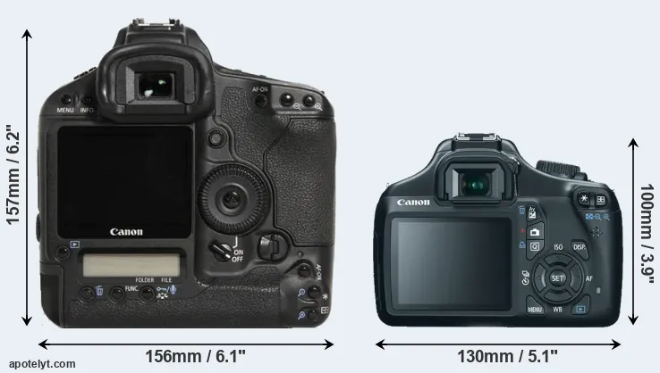 The above size and weight comparisons are to some extent incomplete since they do not consider the interchangeable lenses that both of these cameras require. A larger imaging sensor (as in the 1D Mark III) will tend to go along with bigger and heavier lenses, while more compact options are available for the smaller-sensor camera (T3). You can compare the optics available in the Canon EF Lens Catalog.
