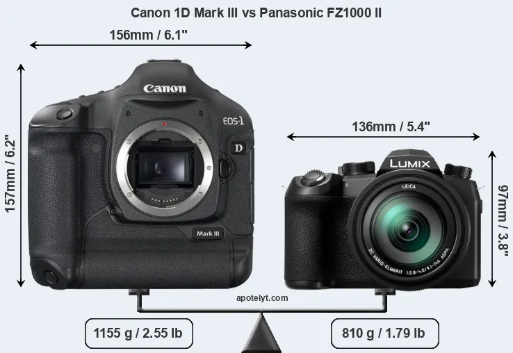 The side-by-side display below illustrates the physical size and weight of the Canon 1D Mark III and the Panasonic FZ1000 II. The two cameras are presented according to their relative size. Three consecutive perspectives from the front, the top, and the back are available. All width, height and depth measures are rounded to the nearest millimeter.