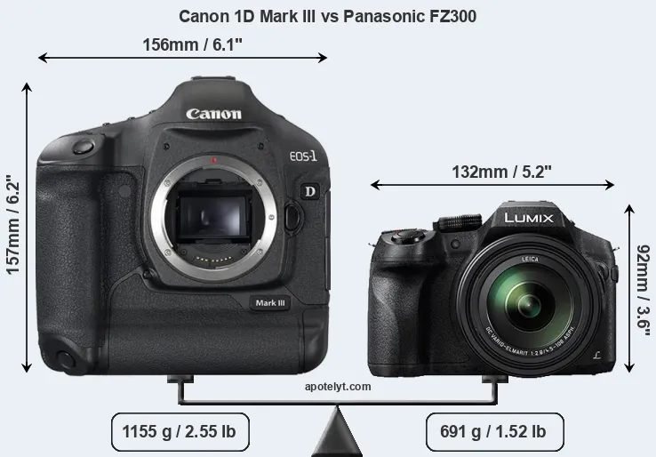 An illustration of the physical size and weight of the Canon 1D Mark III and the Panasonic FZ300 is provided in the side-by-side display below. The two cameras are presented according to their relative size. Three consecutive perspectives from the front, the top, and the back are available. All width, height and depth dimensions are rounded to the nearest millimeter.