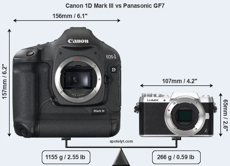 The physical size and weight of the Canon 1D Mark III and the Panasonic GF7 are illustrated in the side-by-side display below. The two cameras are presented according to their relative size. Three successive views from the front, the top, and the rear are shown. All width, height and depth measures are rounded to the nearest millimeter.