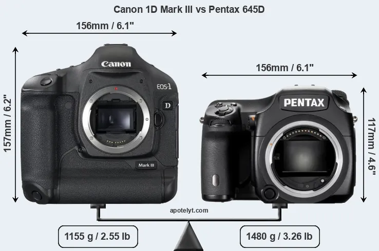 Going beyond this snapshot of core features and characteristics, what are the differences between the Canon EOS-1D Mark III and the Pentax 645D? Which one should you buy? Read on to find out how these two cameras compare with respect to their body size, their imaging sensors, their shooting features, their input-output connections, and their reception by expert reviewers.