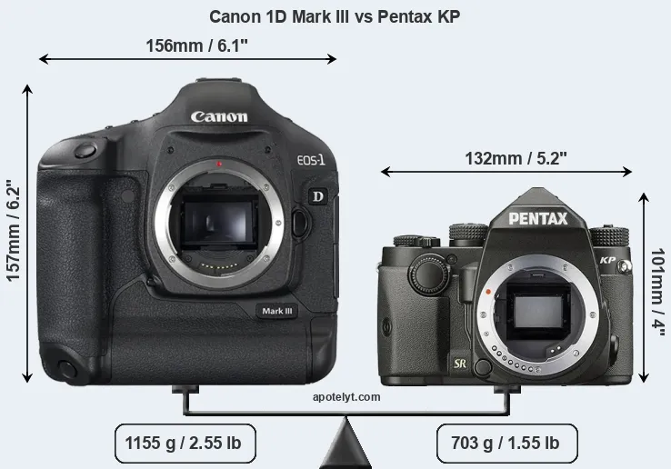 The side-by-side display below illustrates the physical size and weight of the Canon 1D Mark III and the Pentax KP. The two cameras are presented according to their relative size. Three successive views from the front, the top, and the rear are shown. All width, height and depth measures are rounded to the nearest millimeter.