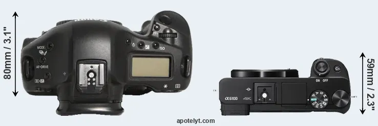 The physical size and weight of the Canon 1D Mark III and the Sony A6100 are illustrated in the side-by-side display below. The two cameras are presented according to their relative size. Three consecutive views from the front, the top, and the rear side are shown. All size dimensions are rounded to the nearest millimeter.