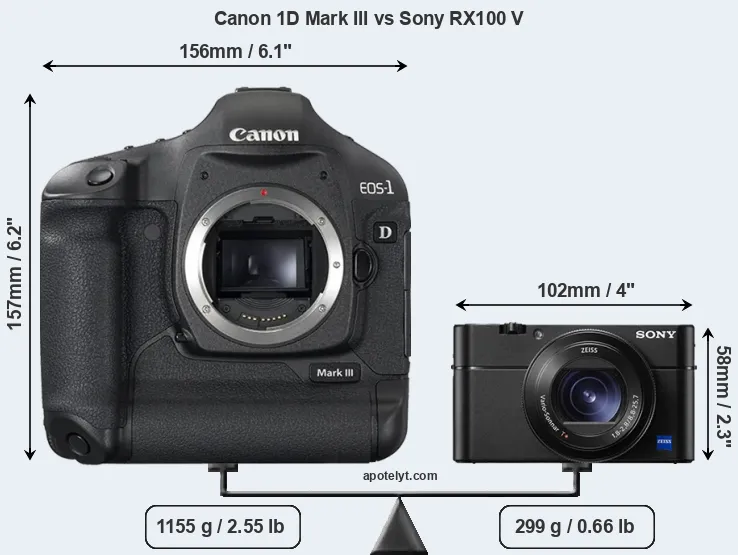 The side-by-side display below illustrates the physical size and weight of the Canon 1D Mark III and the Sony RX100 V. The two cameras are presented according to their relative size. Three consecutive perspectives from the front, the top, and the back are available. All size dimensions are rounded to the nearest millimeter.