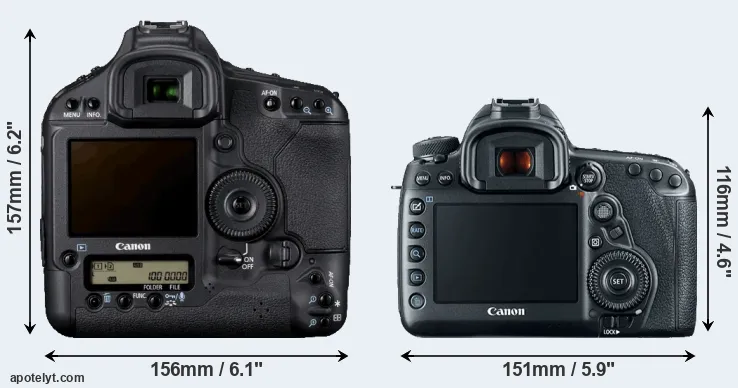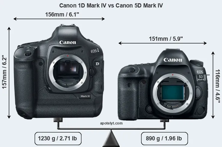 The side-by-side display below illustrates the physical size and weight of the Canon 1D Mark IV and the Canon 5D Mark IV. The two cameras are presented according to their relative size. Three consecutive perspectives from the front, the top, and the back are available. All width, height and depth measures are rounded to the nearest millimeter.