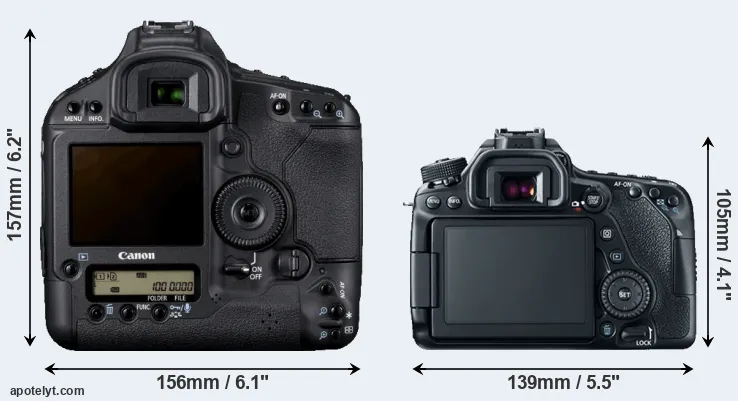 The physical size and weight of the Canon 1D Mark IV and the Canon 80D are illustrated in the side-by-side display below. The two cameras are presented according to their relative size. Three consecutive views from the front, the top, and the rear side are shown. All width, height and depth measures are rounded to the nearest millimeter.