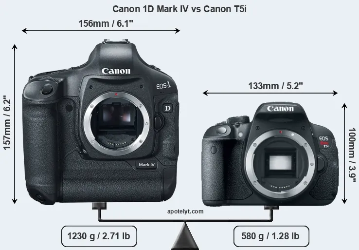 The physical size and weight of the Canon 1D Mark IV and the Canon T5i are illustrated in the side-by-side display below. The two cameras are presented according to their relative size. Three consecutive views from the front, the top, and the rear side are shown. All width, height and depth measures are rounded to the nearest millimeter.