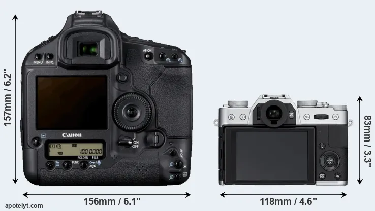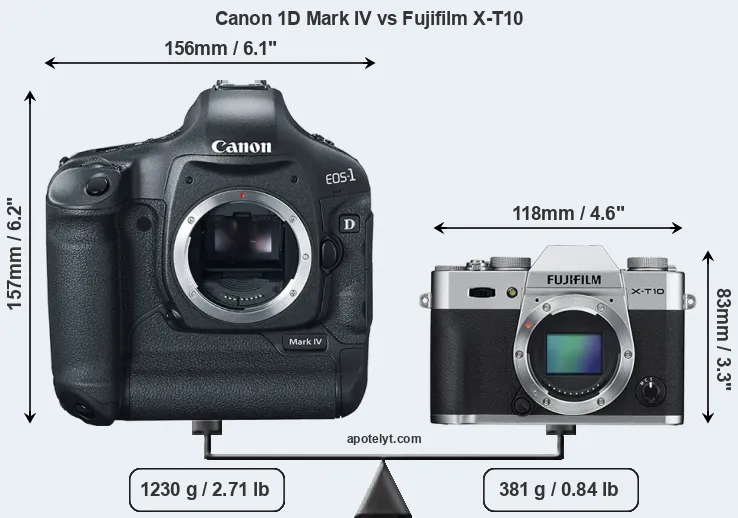 The physical size and weight of the Canon 1D Mark IV and the Fujifilm X-T10 are illustrated in the side-by-side display below. The two cameras are presented according to their relative size. Three consecutive perspectives from the front, the top, and the back are available. All width, height and depth measures are rounded to the nearest millimeter.