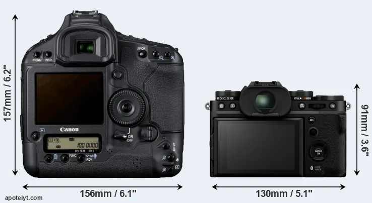 An illustration of the physical size and weight of the Canon 1D Mark IV and the Fujifilm X-T5 is provided in the side-by-side display below. The two cameras are presented according to their relative size. Three successive views from the front, the top, and the rear are shown. All width, height and depth dimensions are rounded to the nearest millimeter.