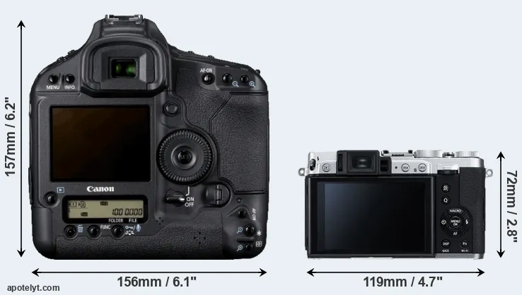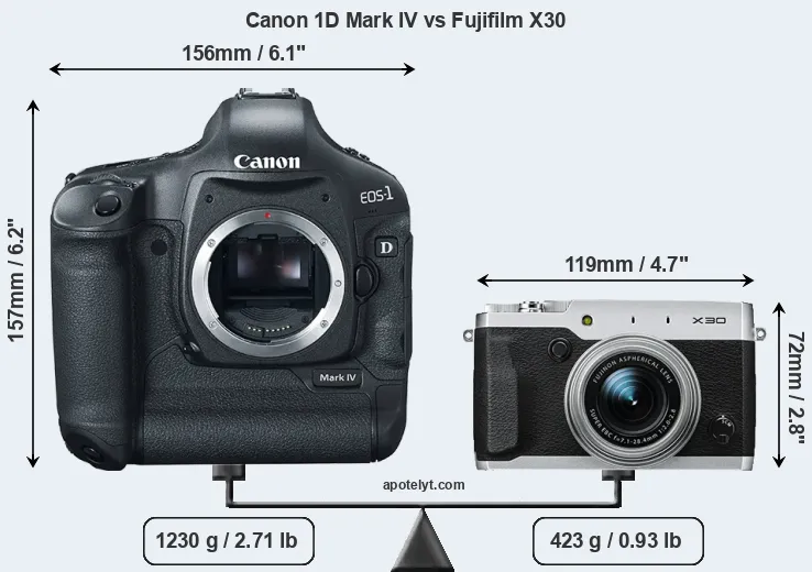 The side-by-side display below illustrates the physical size and weight of the Canon 1D Mark IV and the Fujifilm X30. The two cameras are presented according to their relative size. Three consecutive perspectives from the front, the top, and the back are available. All width, height and depth dimensions are rounded to the nearest millimeter.