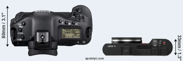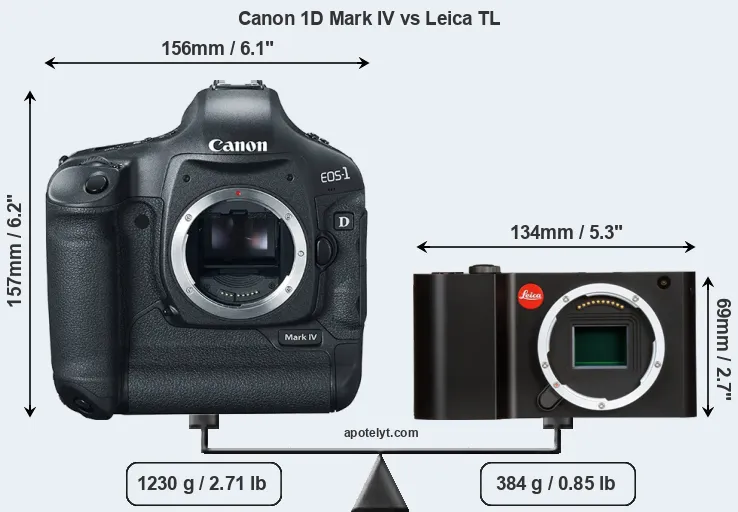 The side-by-side display below illustrates the physical size and weight of the Canon 1D Mark IV and the Leica TL. The two cameras are presented according to their relative size. Three consecutive perspectives from the front, the top, and the back are available. All width, height and depth measures are rounded to the nearest millimeter.