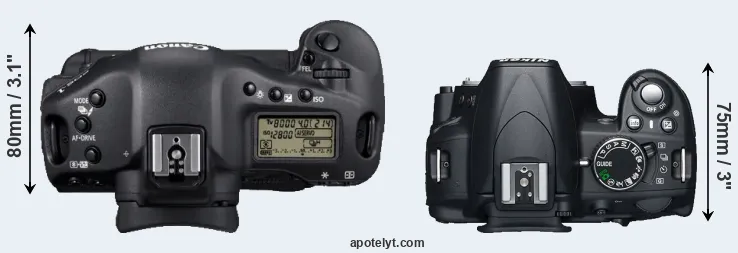 The physical size and weight of the Canon 1D Mark IV and the Nikon D3100 are illustrated in the side-by-side display below. The two cameras are presented according to their relative size. Three consecutive views from the front, the top, and the rear side are shown. All width, height and depth dimensions are rounded to the nearest millimeter.