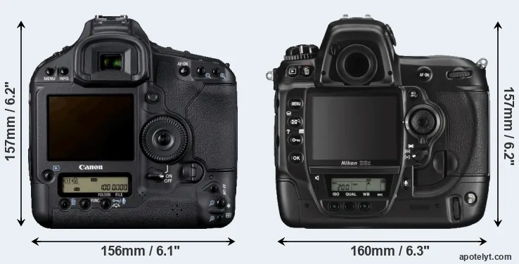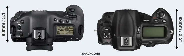 The physical size and weight of the Canon 1D Mark IV and the Nikon D3X are illustrated in the side-by-side display below. The two cameras are presented according to their relative size. Three consecutive views from the front, the top, and the rear side are shown. All width, height and depth dimensions are rounded to the nearest millimeter.