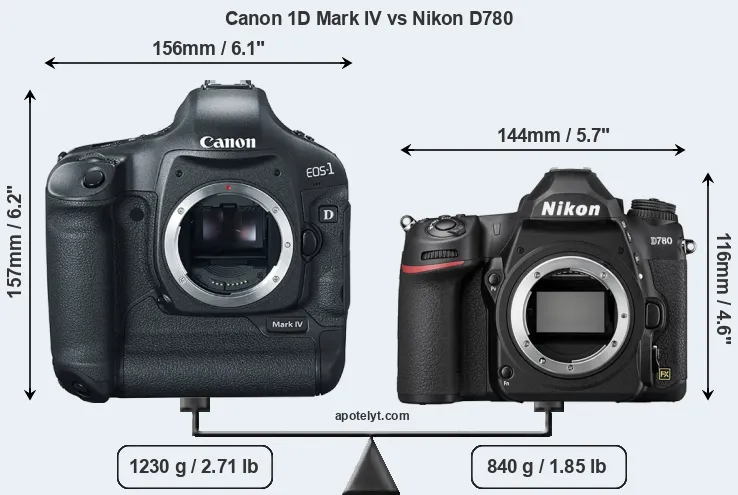 The physical size and weight of the Canon 1D Mark IV and the Nikon D780 are illustrated in the side-by-side display below. The two cameras are presented according to their relative size. Three successive views from the front, the top, and the rear are shown. All width, height and depth measures are rounded to the nearest millimeter.