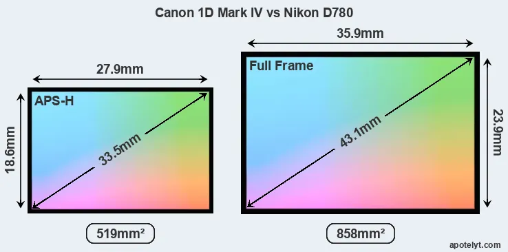 Of the two cameras under consideration, the Canon 1D Mark IV features an APS-H sensor and the Nikon D780 a full frame sensor. The sensor area in the D780 is 65 percent bigger. As a result of these sensor size differences, the cameras have a format factor of, respectively, 1.3 and 1.0. Both cameras have a native aspect ratio (sensor width to sensor height) of 3:2.