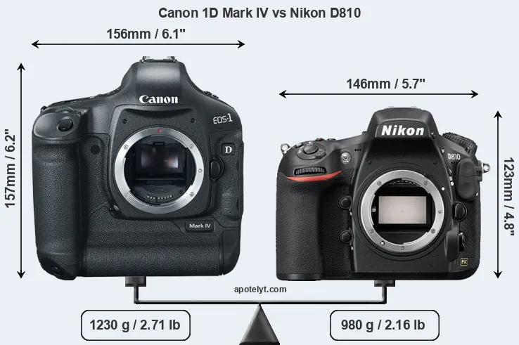 The side-by-side display below illustrates the physical size and weight of the Canon 1D Mark IV and the Nikon D810. The two cameras are presented according to their relative size. Three consecutive views from the front, the top, and the rear side are shown. All size dimensions are rounded to the nearest millimeter.