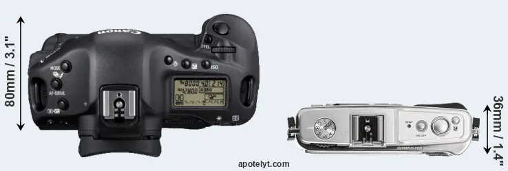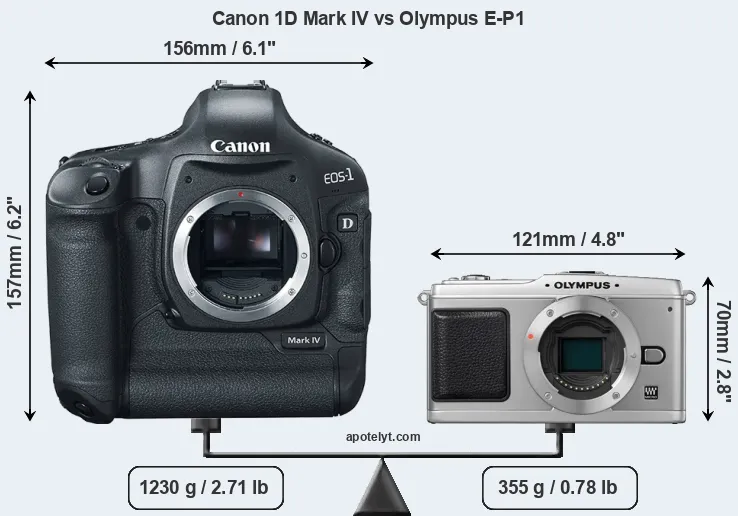 The side-by-side display below illustrates the physical size and weight of the Canon 1D Mark IV and the Olympus E-P1. The two cameras are presented according to their relative size. Three successive views from the front, the top, and the rear are shown. All size dimensions are rounded to the nearest millimeter.