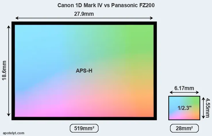 Of the two cameras under consideration, the Canon 1D Mark IV features an APS-H sensor and the Panasonic FZ200 a 1/2.3-inch sensor. The sensor area in the FZ200 is 95 percent smaller. As a result of these sensor size differences, the cameras have a format factor of, respectively, 1.3 and 5.6. The sensor in the 1D Mark IV has a native 3:2 aspect ratio, while the one in the FZ200 offers a 4:3 aspect.