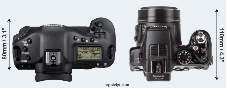 The side-by-side display below illustrates the physical size and weight of the Canon 1D Mark IV and the Panasonic FZ200. The two cameras are presented according to their relative size. Three successive views from the front, the top, and the rear are shown. All size dimensions are rounded to the nearest millimeter.