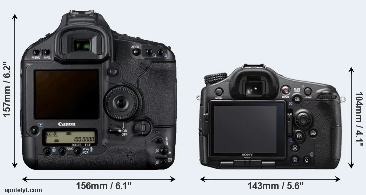 The side-by-side display below illustrates the physical size and weight of the Canon 1D Mark IV and the Sony A77 II. The two cameras are presented according to their relative size. Three successive views from the front, the top, and the rear are shown. All size dimensions are rounded to the nearest millimeter.