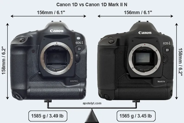 In this particular case, the Canon 1D and the Canon 1D Mark II N have exactly the same width and height, and, thus, have identically-sized bodies. However, the 1D Mark II N is slightly lighter (1 percent) than the 1D. In this context, it is worth noting that both cameras are splash and dust-proof and can, hence, be used in inclement weather conditions or harsh environments.