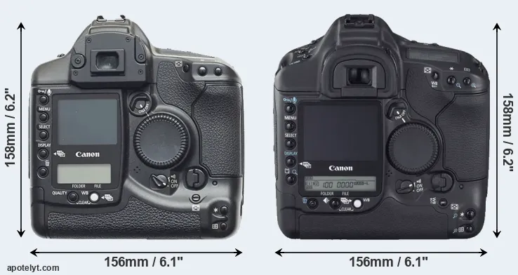 | 6. | Canon 1Ds | 156 mm | 158 mm | 80 mm | 1265 g | 600 | Y | Sep 2002 | US$ 8 999 | ebay.com | |