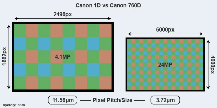 Despite having a smaller sensor, the 760D offers a higher resolution of 24 megapixels, compared with 4.1 MP of the 1D. This megapixels advantage comes at the cost of a higher pixel density and a smaller size of the individual pixel (with a pixel pitch of 3.72μm versus 11.56μm for the 1D). However, it should be noted that the 760D is much more recent (by 13 years and 4 months) than the 1D, and its sensor will have benefitted from technological advances during this time that make it possible to gather light more efficiently.