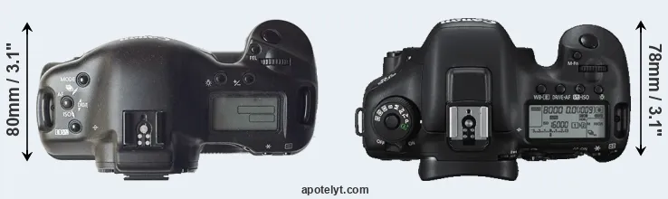 The physical size and weight of the Canon 1D and the Canon 7D II are illustrated in the side-by-side display below. The two cameras are presented according to their relative size. Three consecutive perspectives from the front, the top, and the back are available. All size dimensions are rounded to the nearest millimeter.