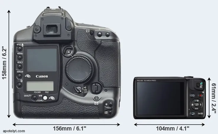 | 7. | Canon 1Ds | 156 mm | 158 mm | 80 mm | 1265 g | 600 | Y | Sep 2002 | US$ 8 999 | ebay.com | |