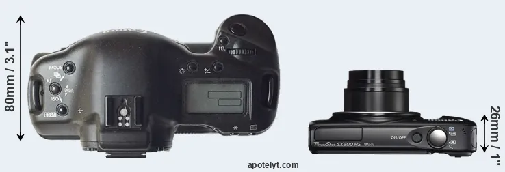 The physical size and weight of the Canon 1D and the Canon SX600 are illustrated in the side-by-side display below. The two cameras are presented according to their relative size. Three consecutive views from the front, the top, and the rear side are shown. All size dimensions are rounded to the nearest millimeter.