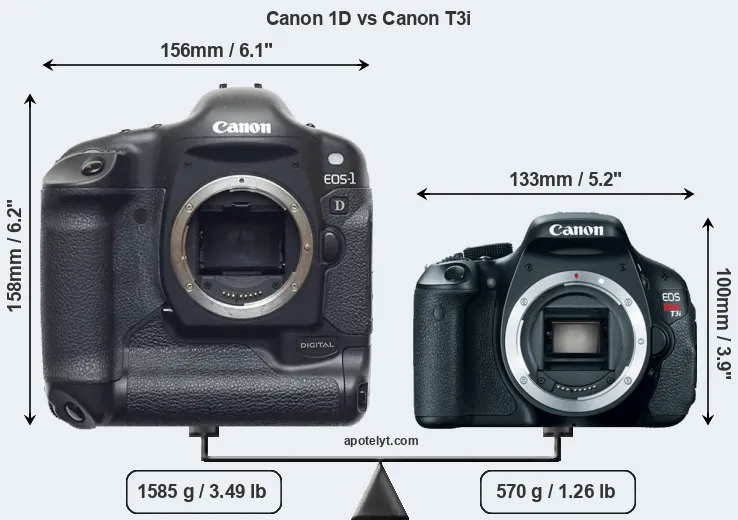 An illustration of the physical size and weight of the Canon 1D and the Canon T3i is provided in the side-by-side display below. The two cameras are presented according to their relative size. Three successive views from the front, the top, and the rear are shown. All width, height and depth dimensions are rounded to the nearest millimeter.