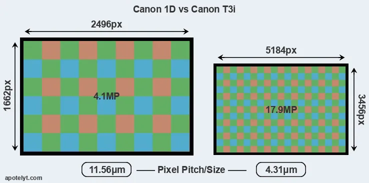 Despite having a smaller sensor, the T3i offers a higher resolution of 17.9 megapixels, compared with 4.1 MP of the 1D. This megapixels advantage comes at the cost of a higher pixel density and a smaller size of the individual pixel (with a pixel pitch of 4.31μm versus 11.56μm for the 1D). However, it should be noted that the T3i is much more recent (by 9 years and 4 months) than the 1D, and its sensor will have benefitted from technological advances during this time that make it possible to gather light more efficiently.