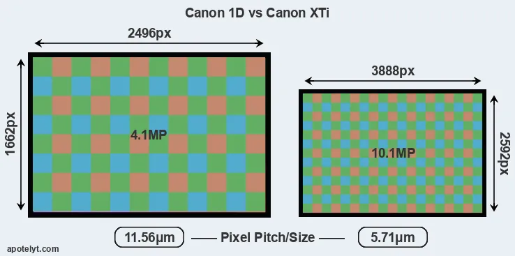 Despite having a smaller sensor, the XTi offers a higher resolution of 10.1 megapixels, compared with 4.1 MP of the 1D. This megapixels advantage comes at the cost of a higher pixel density and a smaller size of the individual pixel (with a pixel pitch of 5.71μm versus 11.56μm for the 1D). However, it should be noted that the XTi is much more recent (by 4 years and 10 months) than the 1D, and its sensor will have benefitted from technological advances during this time that make it possible to gather light more efficiently.