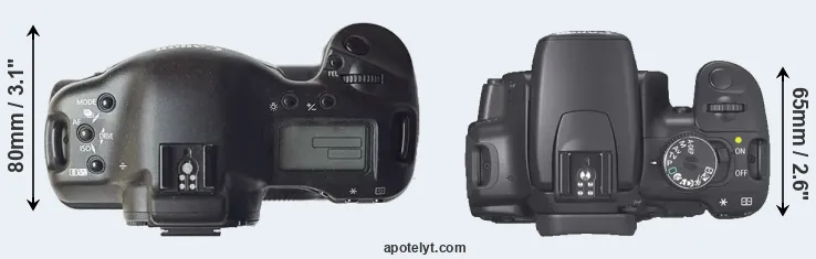 The above size and weight comparisons are to some extent incomplete since they do not consider the interchangeable lenses that both of these cameras require. A larger imaging sensor (as in the 1D) will tend to go along with bigger and heavier lenses, while more compact options are available for the smaller-sensor camera (XTi). You can compare the optics available in the Canon EF Lens Catalog.
