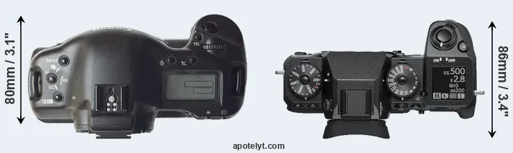 An illustration of the physical size and weight of the Canon 1D and the Fujifilm X-H1 is provided in the side-by-side display below. The two cameras are presented according to their relative size. Three consecutive views from the front, the top, and the rear side are shown. All width, height and depth dimensions are rounded to the nearest millimeter.