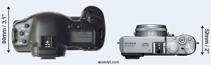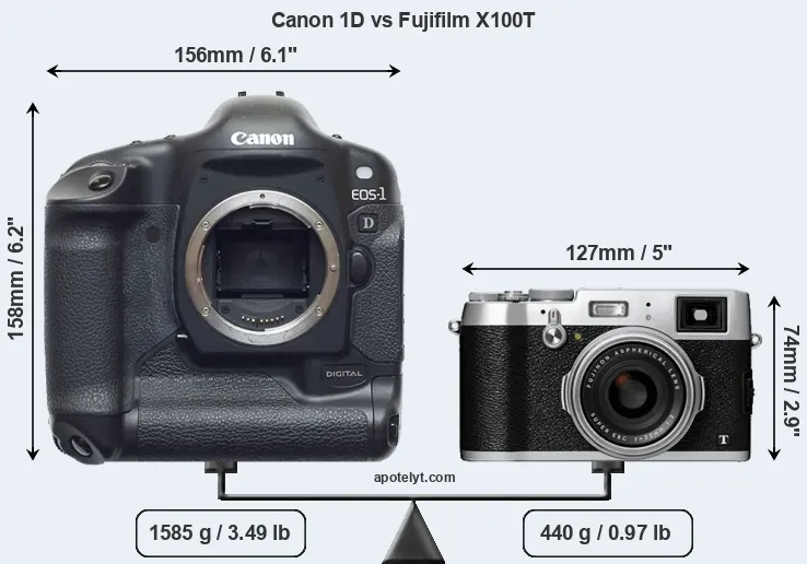 The physical size and weight of the Canon 1D and the Fujifilm X100T are illustrated in the side-by-side display below. The two cameras are presented according to their relative size. Three consecutive perspectives from the front, the top, and the back are available. All width, height and depth dimensions are rounded to the nearest millimeter.